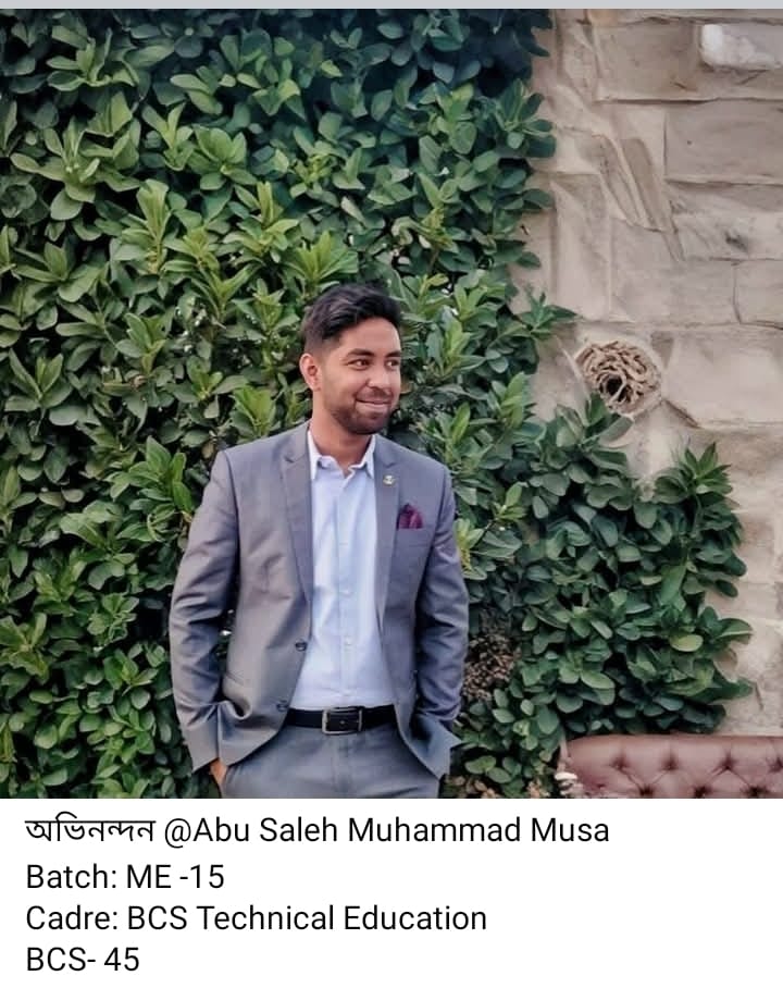 Nishat Islam from Batch EWCE-04 has been selected for the BCS Technical Education (Civil) cadre and is currently serving as a Lecturer in the EWCE Department at MIST. Md. Rifat Chowdhury from Batch EWCE-02 has qualified in the BCS Administration cadre and is currently serving as an Instructor at Khulna Polytechnic Institute. Additionally, Abu Saleh Muhammad Musa from Batch ME-15 has qualified in the BCS Technical Education cadre.