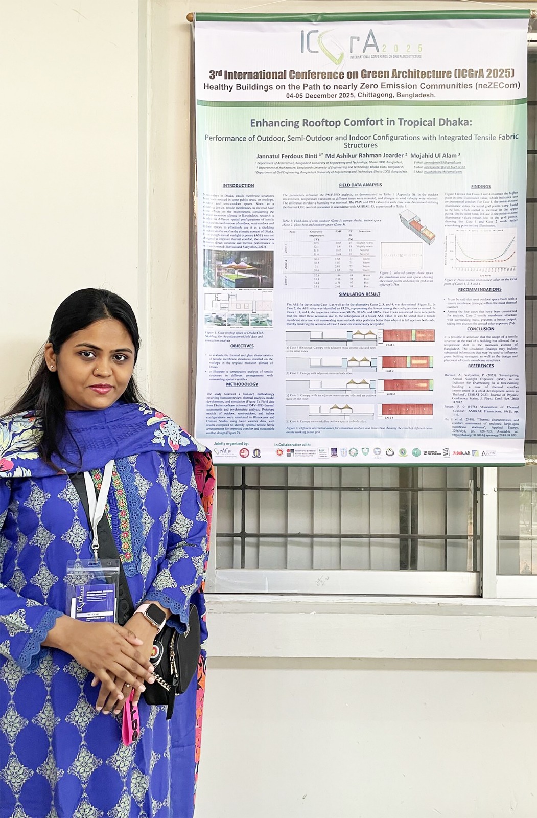 Alumna Jannatul Ferdous Binti (ARCH 2) presented her research paper titled “Enhancing Rooftop Comfort in Tropical Dhaka: Performance of Outdoor, Semi-Outdoor, and Indoor Configurations with Integrated Tensile Fabric Structures,” and also showcased a poster presentation on the same resear... Read More