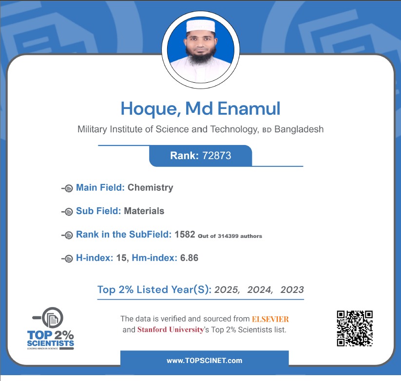 The Military Institute of Science and Technology (MIST) is proud to announce that our faculty members, Lieutenant Colonel Muhammad Nazrul Islam and Professor Dr. Md Enamul Hoque, have been named among the World's Top 2% Scientists by Stanford University and Elsevier Data for this year.